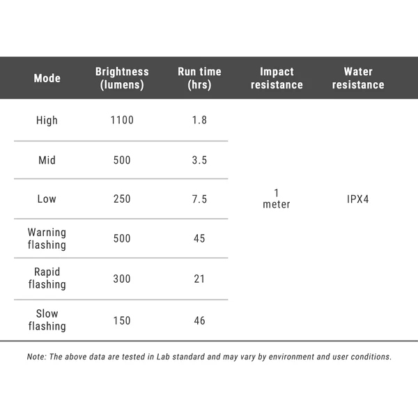 Eye-catching warning flashing mode to keep you visible at daytime riding.